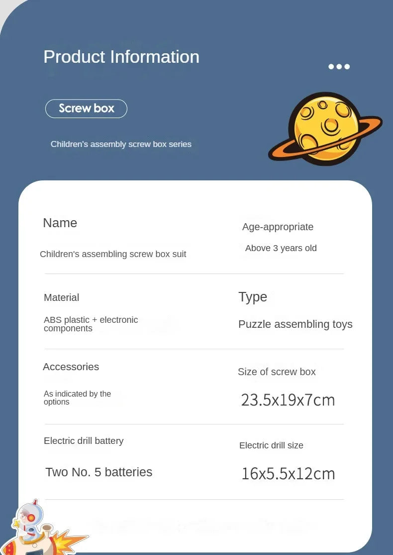 • Electric Drill Screw Nut Feature :The electronic drill screw nut feature of this toy gives children a realistic play experience, fostering an interest in tools and building skills.