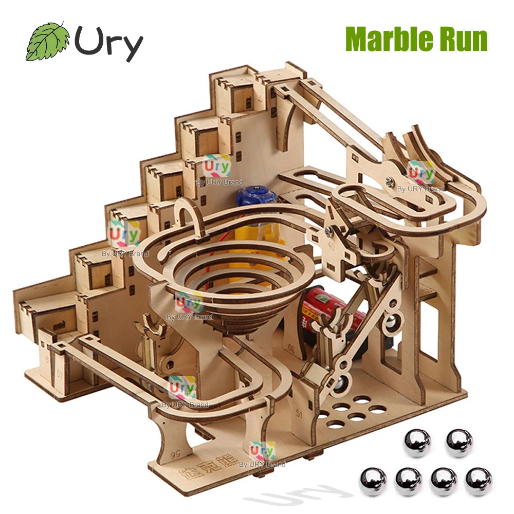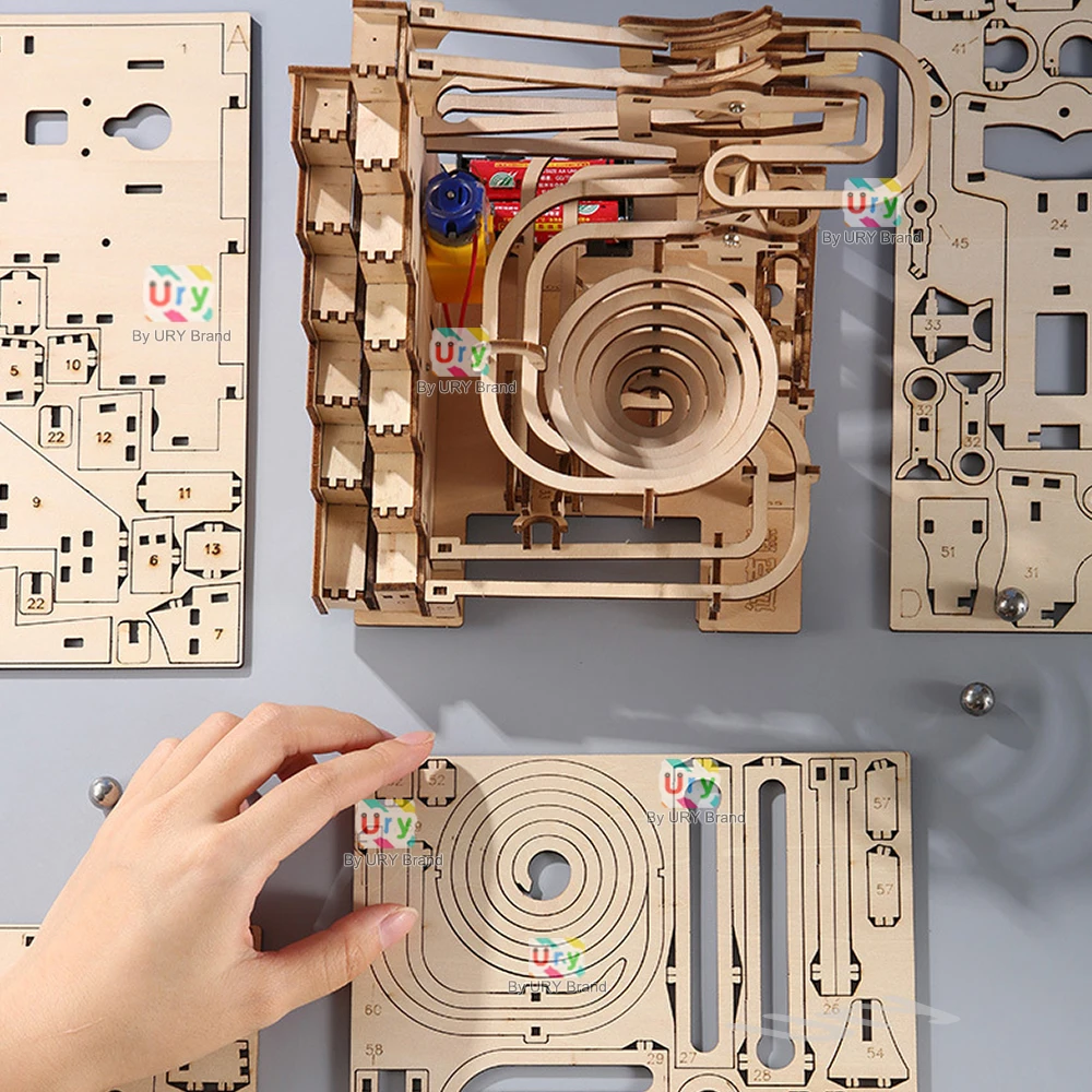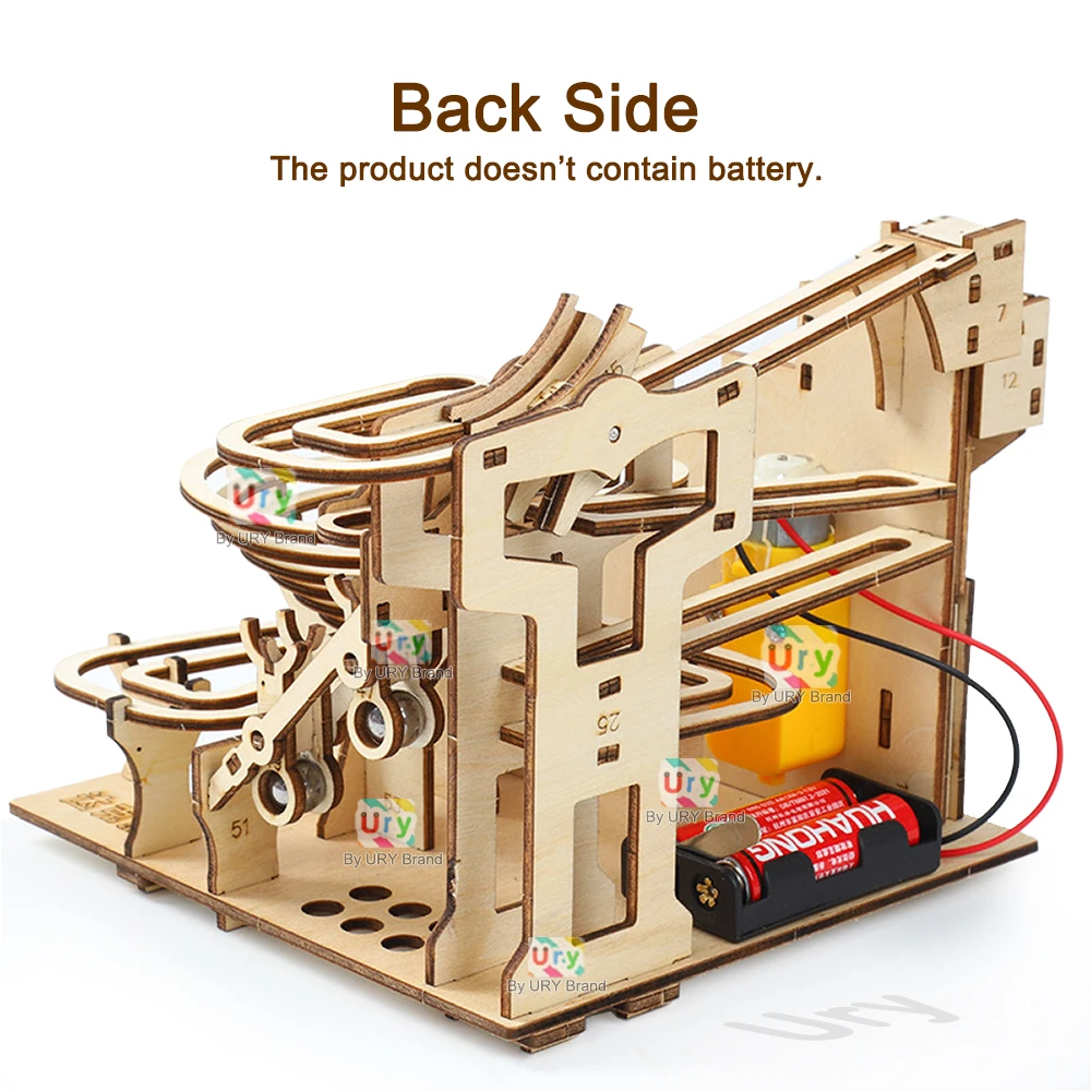 Ury 3D Wooden Puzzles Electric Staircase Track Device Marble Run Set Mechanical Model Science Maze 6 Balls Assembly Gift for Kid